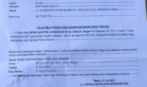 Telah kehilangan sebuah Surat STNK kendaraan *roda 4 Atas nama Pemkab Natuna Dengan Nomor* registrasi BP 1011 N : Merek Toyota Avanza Warna Hitam Metalik,isi Silinder 1,298 CC, No.mesin DC 23213,No.rangka MHFM1BA3JKO450568. Bagi yang menemukan  STNK tersebut dapat menghubungi saudara Darlis dengan nomor telepon 081372397718. Adapun tujuan berita ini untuk rangkaian proses pengurusan STNK baru. ***
