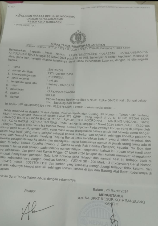 Batam,GejolakNews- Safriyon korban, Penipuan, Penggelapan satu buah alat Berat Cobelko, dimana Cobelko miliknya itu tampa sepengetahuannya dijuwal oleh Isa Hendra Dewa.